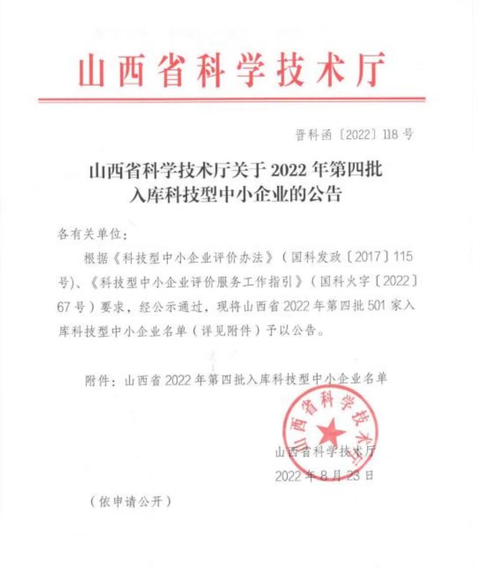根據(jù)《科技型中小企業(yè)評價辦法》(國科發(fā)政[2017]115號)、《科技型中小企業(yè)評價服務工作指引》(國科火字[2022]67號)要求,經(jīng)公示通過,我公司入庫2022年第四批科技型中小企業(yè)。